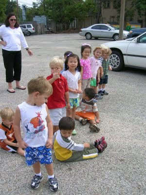 We had our first fire drill this week. We walked out to the back parking lot and stood on one of the yellow lines (more or less). I think a few Bunnies were disappointed that firefighters were NOT coming to school.